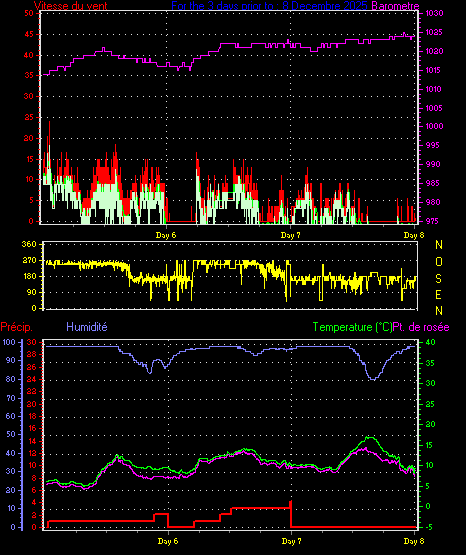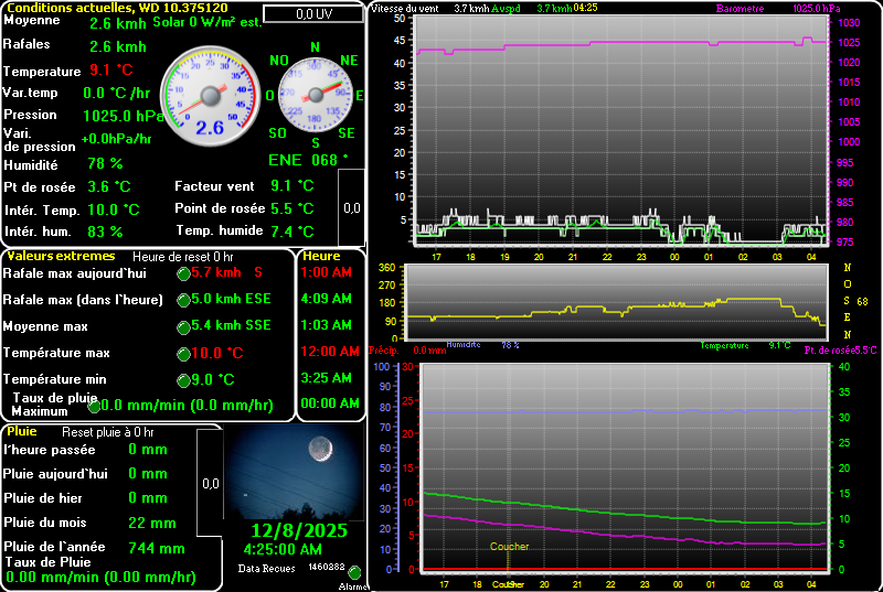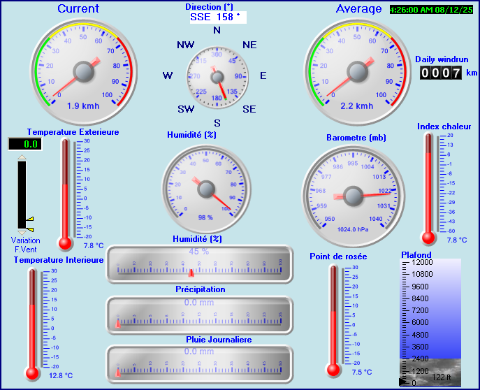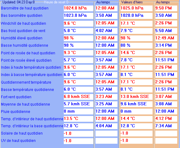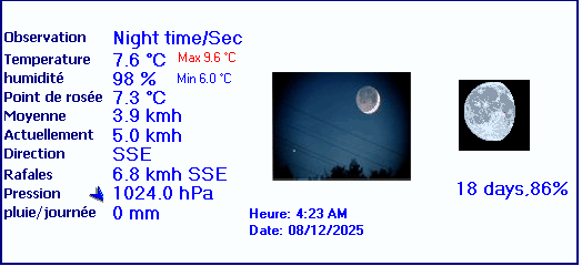 | Temperature Maximum (depuis minuit) | 9.6°C at: 12:05 AM | Temperature Minimum (depuis minuit) | 6.4°C at: 3:16 AM |