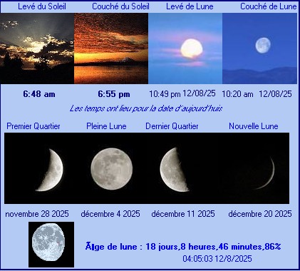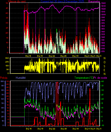 | Rafale maximum (depuis minuit) | 6.8 kmh (3.7 kts) at: 3:23 AM | Maximum des moyennes à 1mn (depuis minuit) | 5.7 kmh (3.1 kts) at: 3:25 AM |