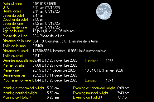 | Météo actuelle | Night time/Sec | Température actuelle | 7.0°C (44.6°F), Apparent temp 5.7°C |